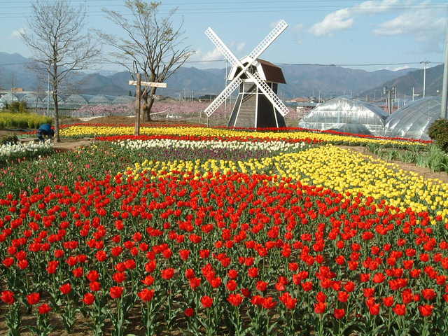 | | | | |  | | ハーブ園のチューリップ。春のハーブ園は色とりどり・・。駅の桜~桃の里~とお花見コースに加えてみては?