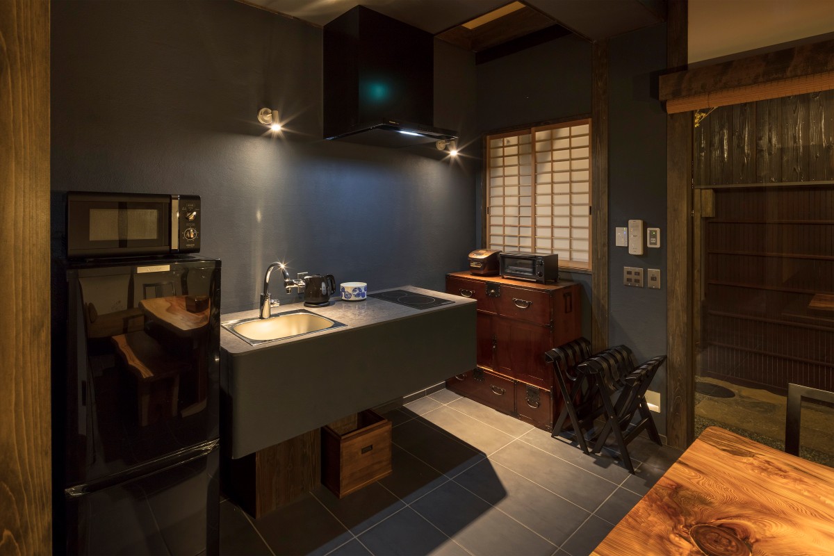 和ご宿泊頂く皆様でお使いいただける、調理器具、IHコンロ、電子レンジ、冷蔵庫もご用意しております。広々とした空間ですので、材料を買ってきて調理するのもおすすめです。