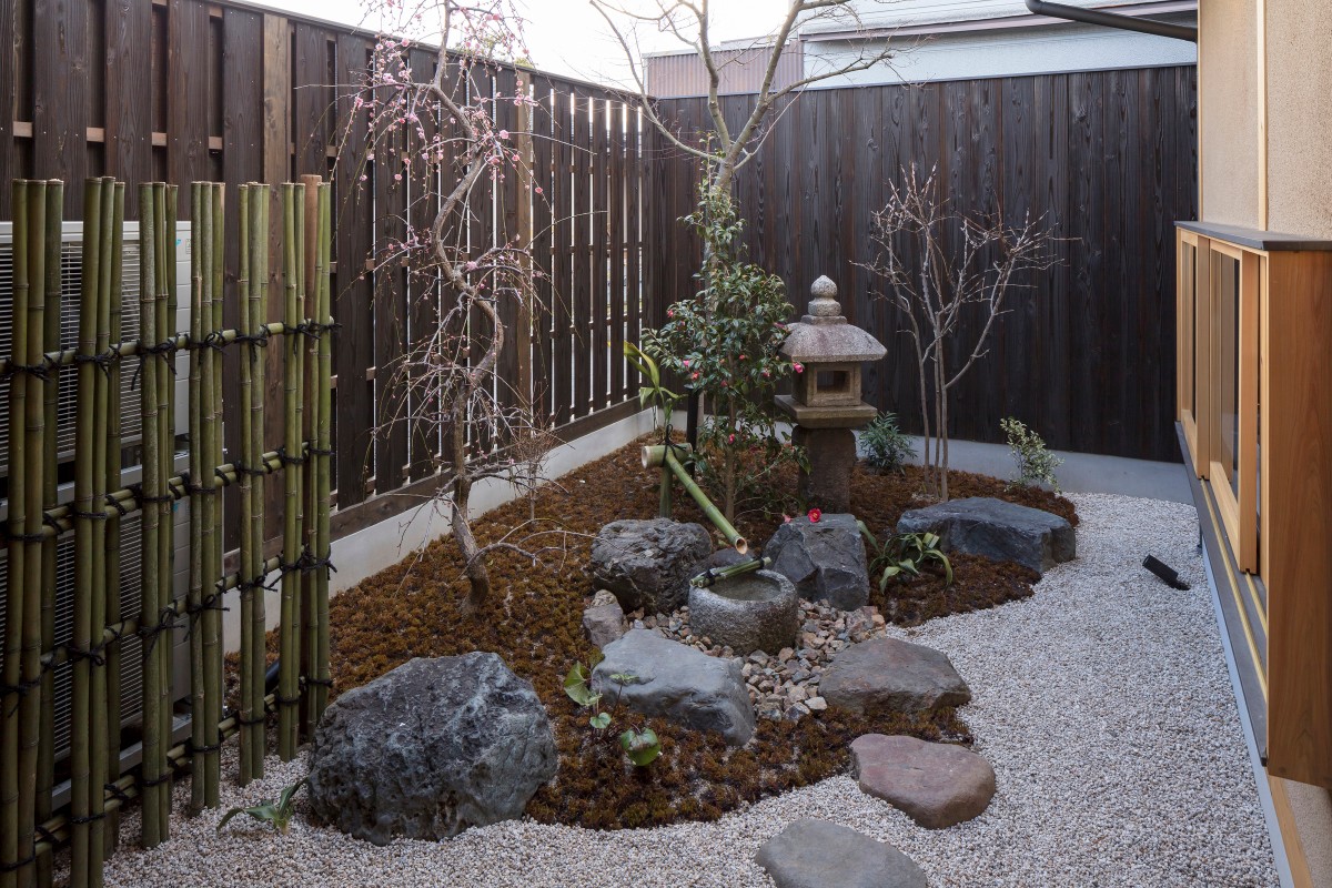 広々とした町家の坪庭には和風の植栽を施しております。隣家を気にされない様、塀を高く造っております。日が沈むと、ライトアップされ四季折々の様子をお楽しみいただけます。