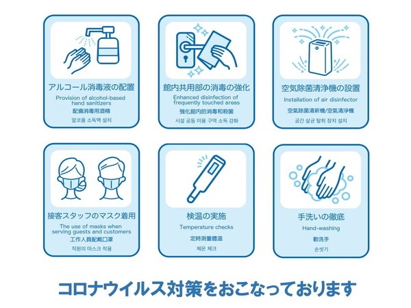 当館では、新型コロナウイルスの感染拡大防止のため、下記の対応を行っております。 ■消毒の実施 ■マスクの着用 ■スタッフの体調管理 ■チェックイン時の検温の実施と健康チェックシートの配布 ■新型コロナウイルスに感染している方のご宿泊 ■ご滞在中の客室清掃