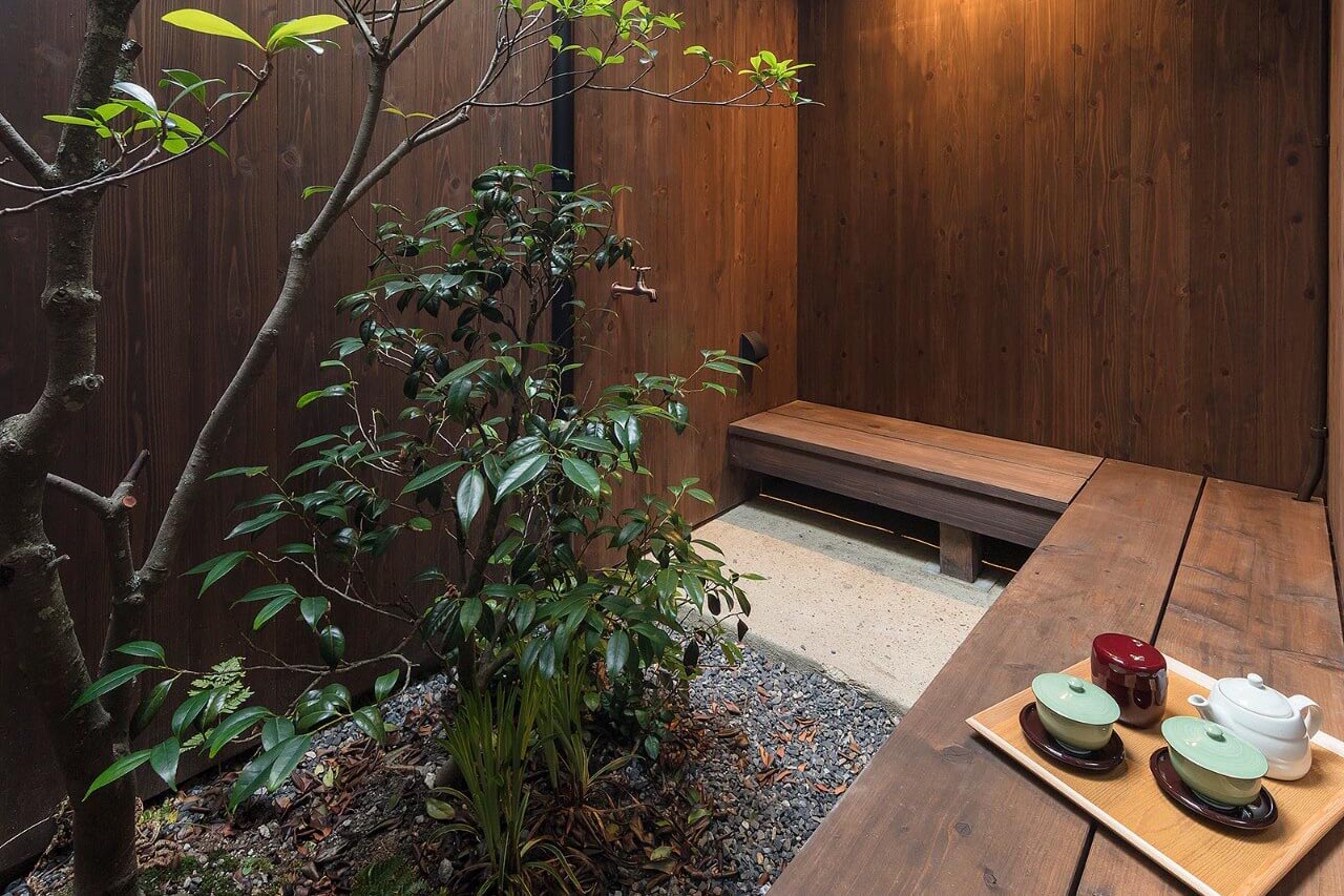 縁側付きの坪庭は、緑に癒されながらゆったりとお茶を飲んでいただける特別な空間。人気観光地・東寺近くでありながら、喧騒を離れ、静けさに包まれたひとときをお過ごしいただけます。