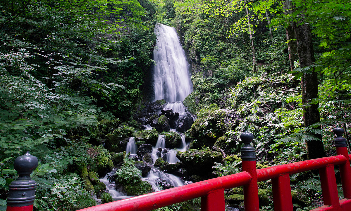 日本の滝百選の不動の滝は、周囲の静かな空気を震わせ、高さ15mの滝が飛沫を上げて垂直に流れ落ちるさまが圧巻です。