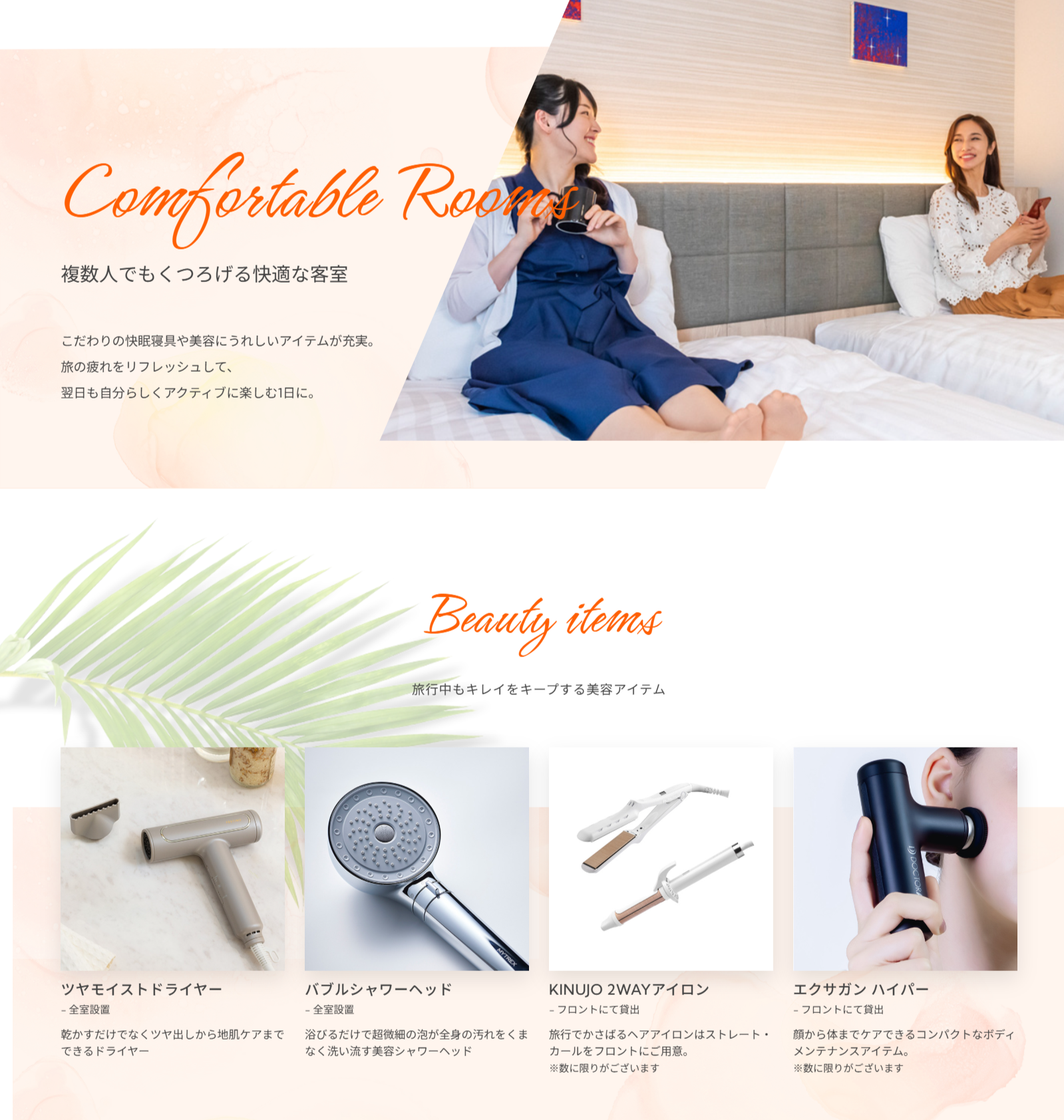 サータブランドと共同で新開発した「チョイス 7ZONE マットレス」を全室導入。7つのゾーニングにより理想の寝姿勢を実現しました。