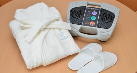 日航新潟オリジナルのコットン100%のバスローブ、フットマッサジャー※1、ズボンプレッサー、クッションをご用意しております。