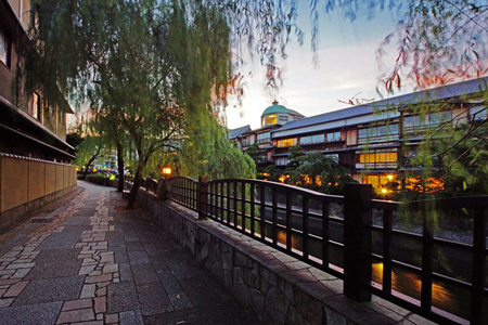 松川右岸に約1.5kmにわたって温泉町の情緒を楽しみながら散策できる敷石の歩道が設けられています。春には遊歩道沿いの桜並木がライトアップされます。