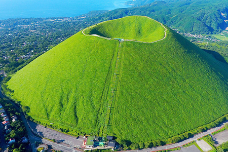 大室山は標高580m、国指定の天然記念物で伊豆東部火山群の中で最大級のスコリア丘です。山頂まではリフトで6分。噴火口跡ではアーチェリー体験もできます。