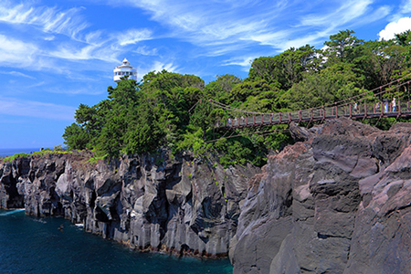 大室山の噴火によってできた溶岩岩石海岸。海岸線には絶壁が連なり、岬から岬へと続く眺めはまさに壮観。門脇崎の海の吊り橋は長さ48m、高さ23mでスリル満点です。