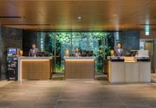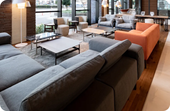 吹き抜けのロビーは、ガラス張りのエントランスから明るい陽光が差し、あたたかみと開放感のある憩いのスペースです。