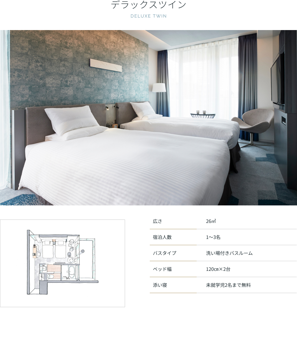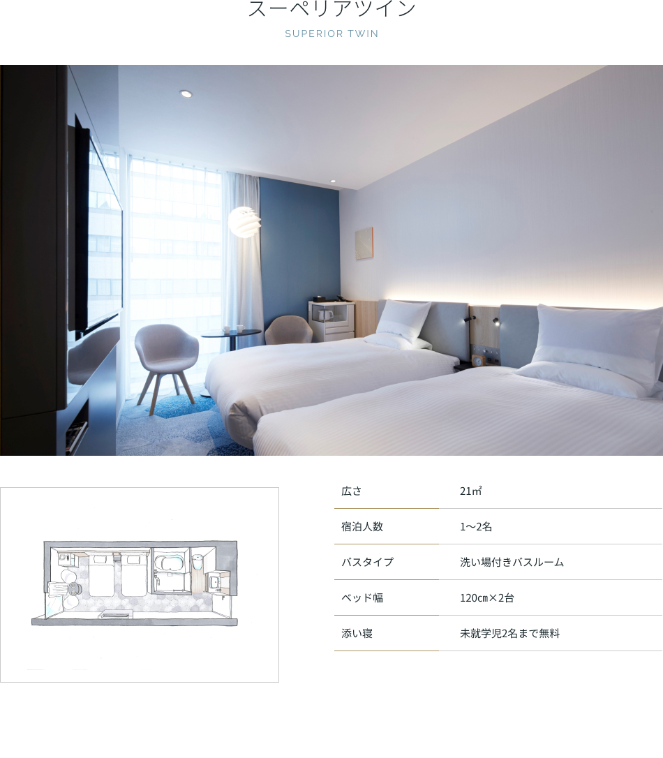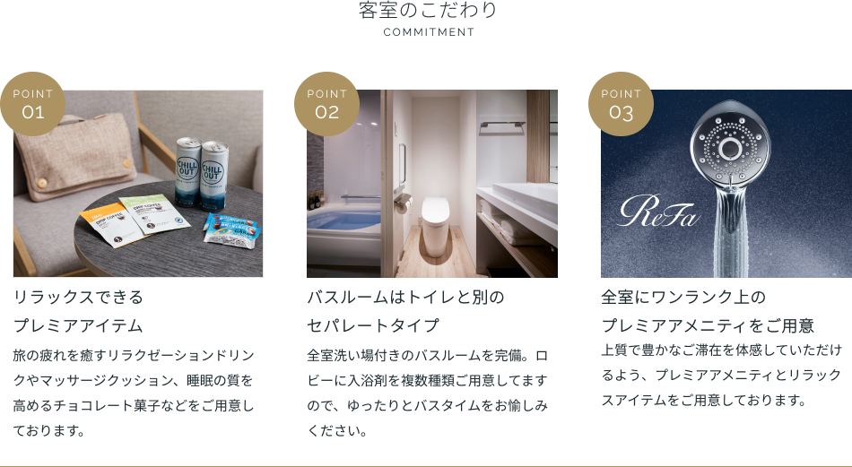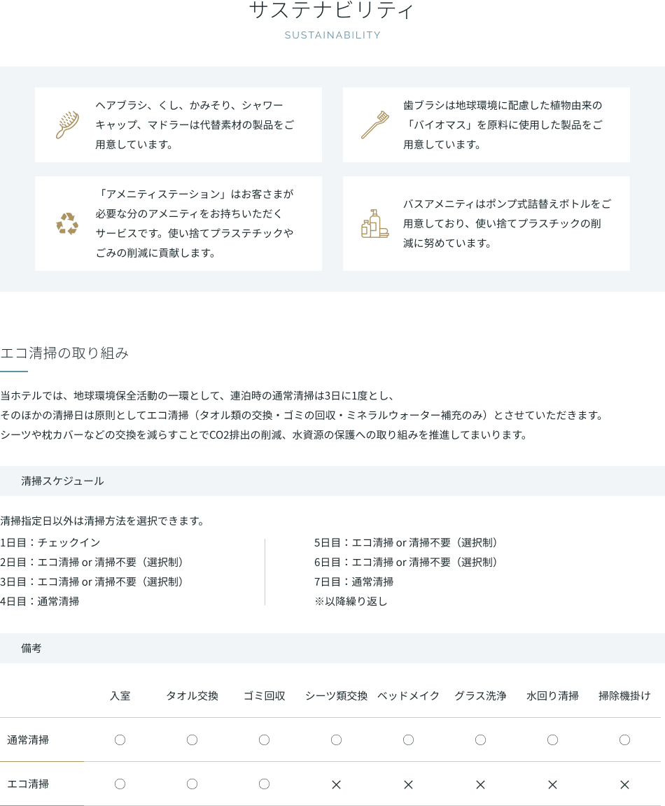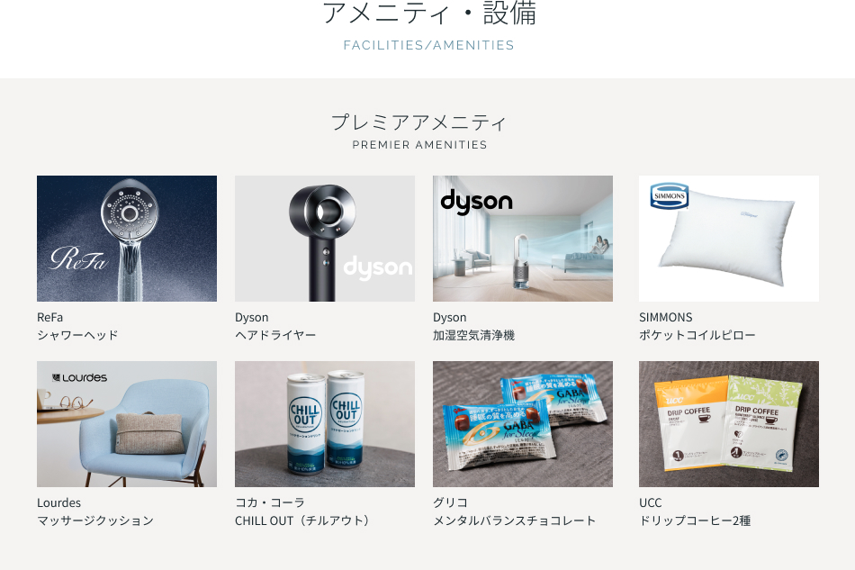 | アメニティ | バスタオル、フェイスタオル、ナイトウェア(セパレート)、スリッパ、シャンプー、ヘアコンディショナー、ボディソープ |