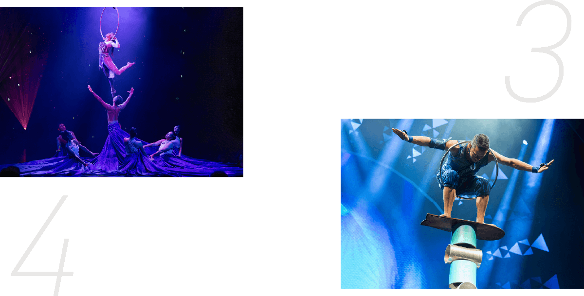 アクロバット、コメディ、フラ、音楽などが融合した壮大な作品をお楽しみください。