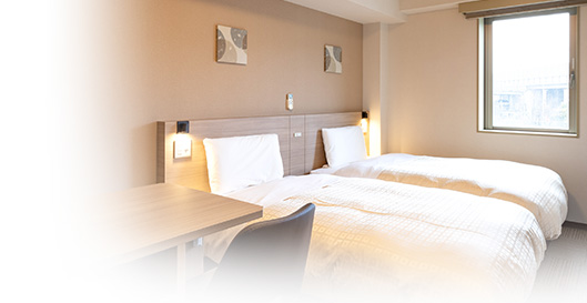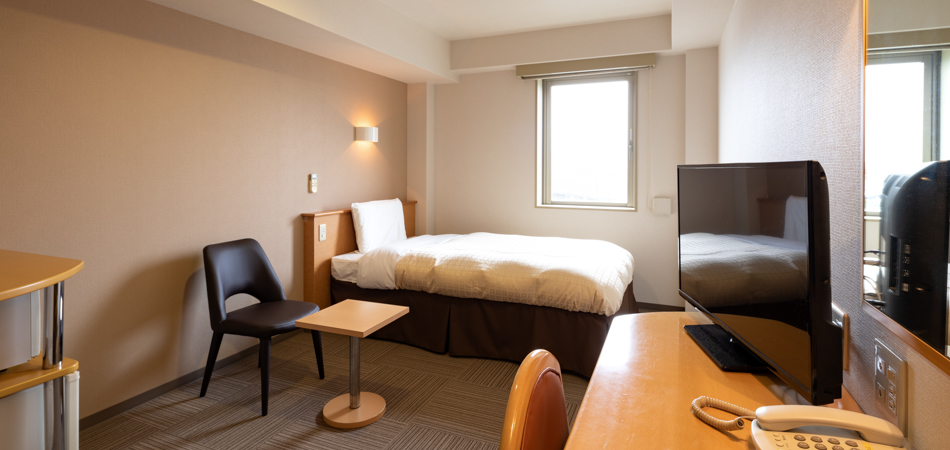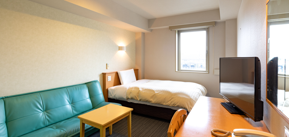 セミダブルサイズのベッドを設置した、ゆったりとした客室で快適にお過ごしください。