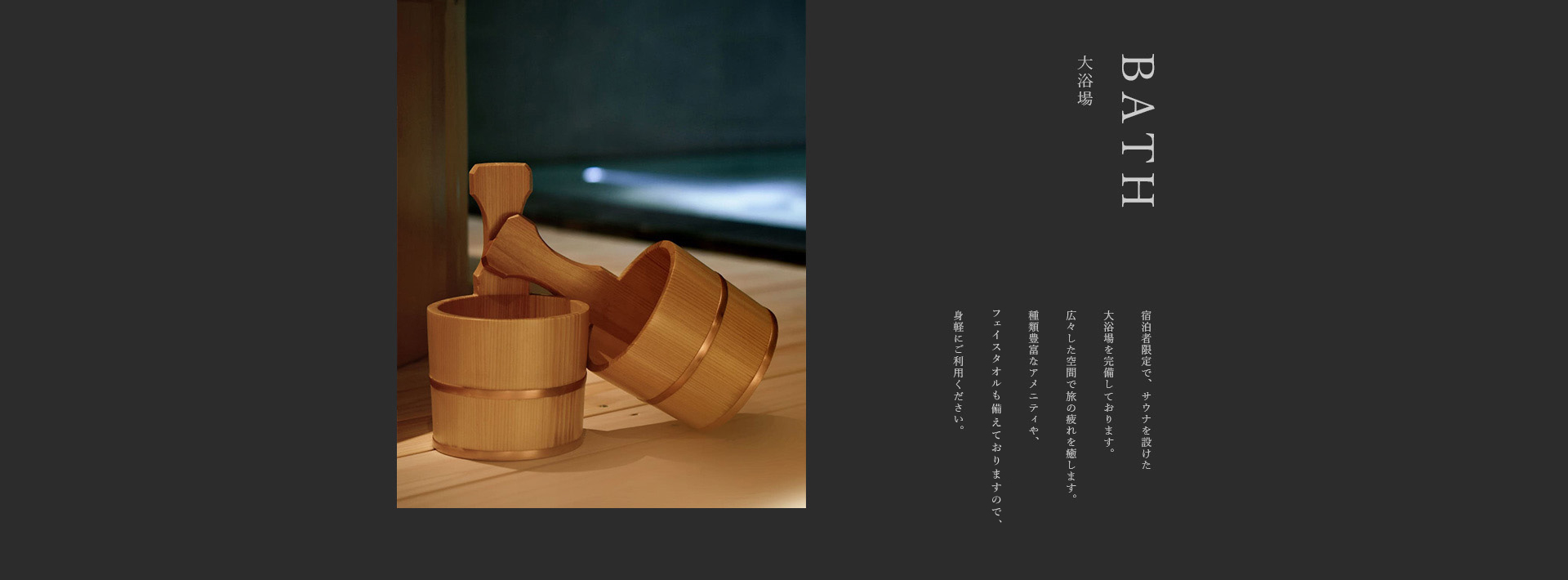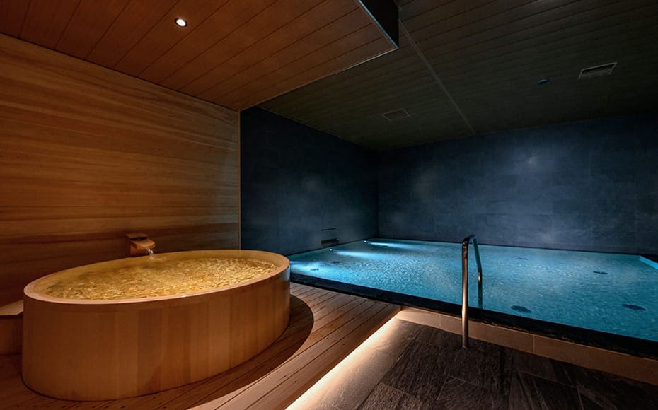 通常の浴場と木で作られたお風呂の2タイプございます。癒しの香りに包まれて、ゆったりとした時間を堪能していただけます。(木のタイプは水風呂となっております。)