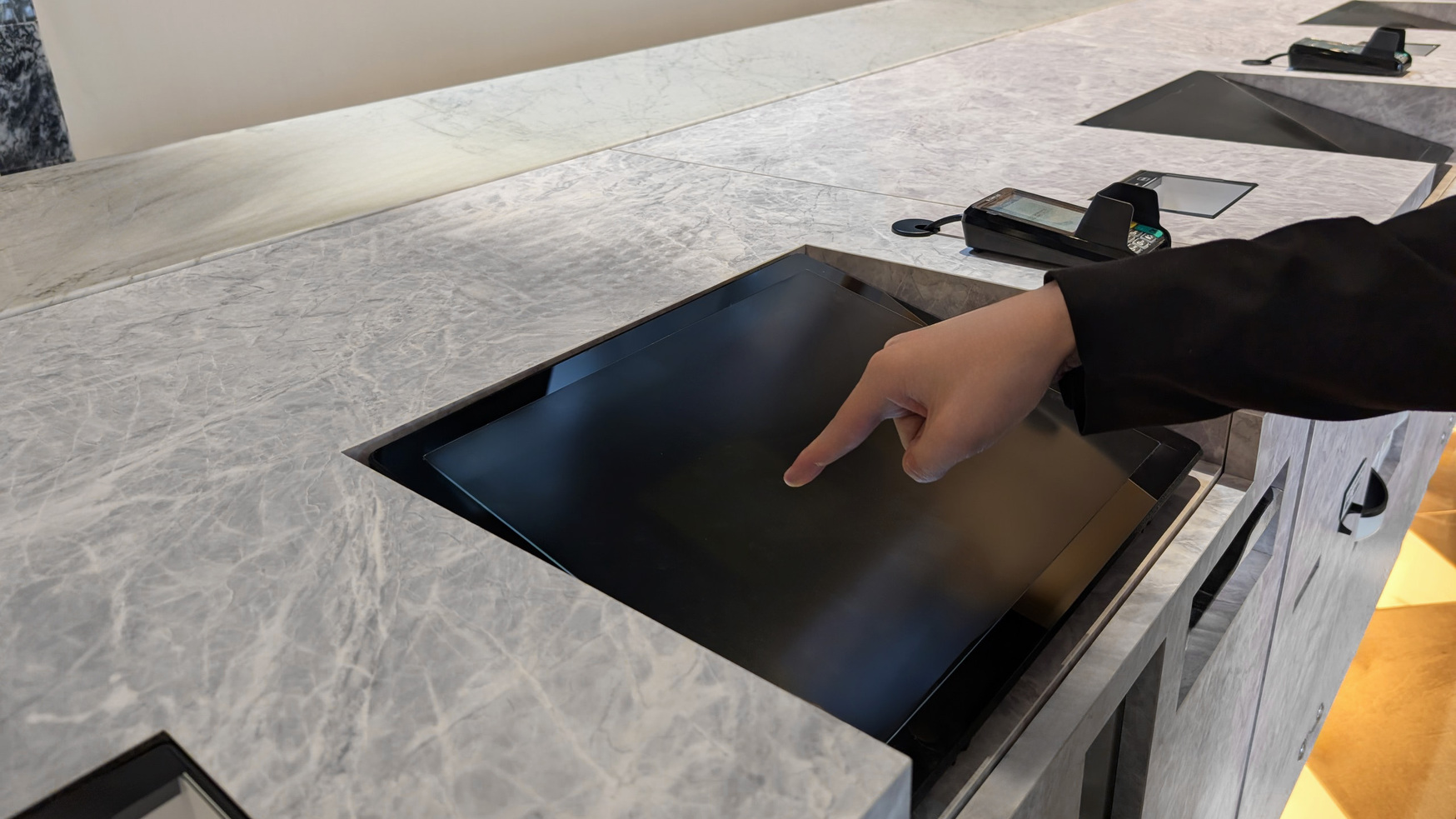 ①チェックイン機画面の「チェックアウト」をタッチしてください