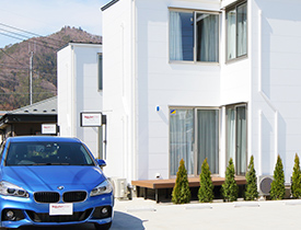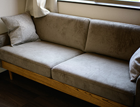 リビングスペースは、フローリングから収納棚に至るまで天然無垢材を使用。