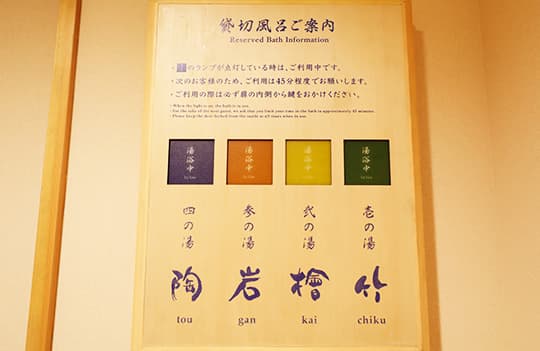 貸切風呂は予約不要、先着順になります。 入り口にございますランプで「空き」をご確認の上、ご自由にご利用ください。