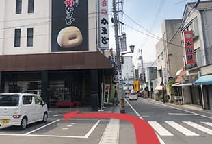 ② 名物 かまど様前の道路を左折します。