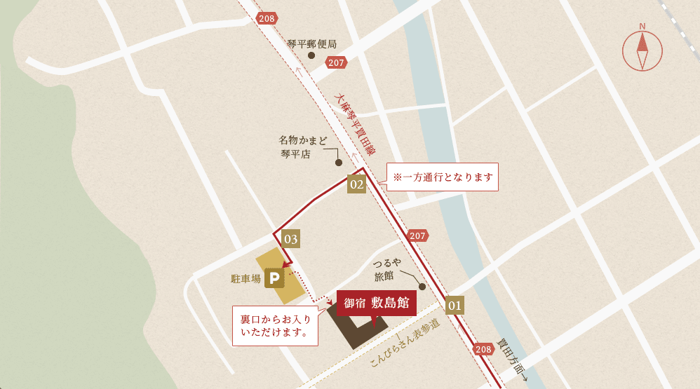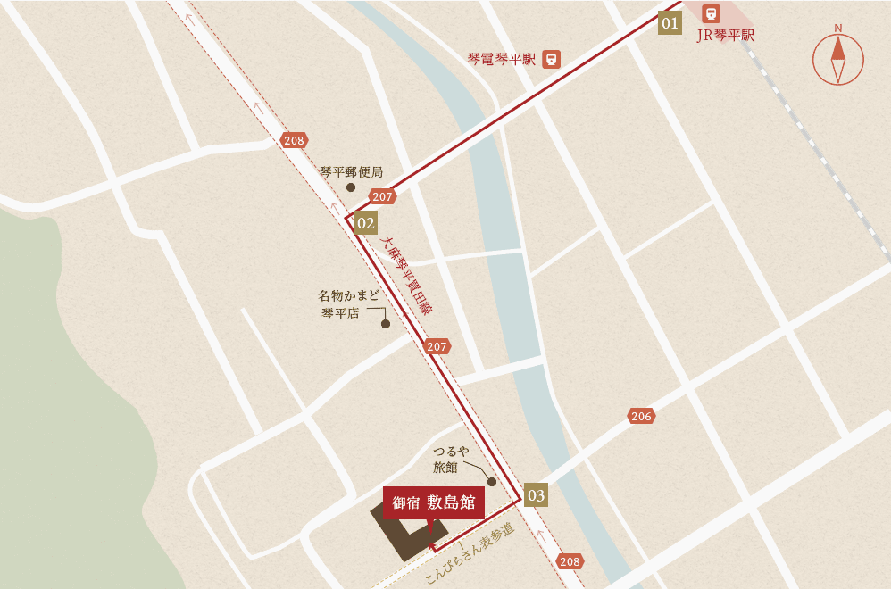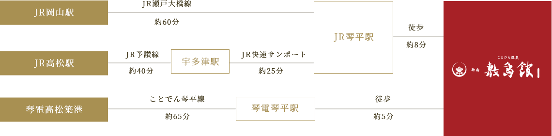 JR琴平駅から徒歩約8分、琴電琴平駅から徒歩約5分。