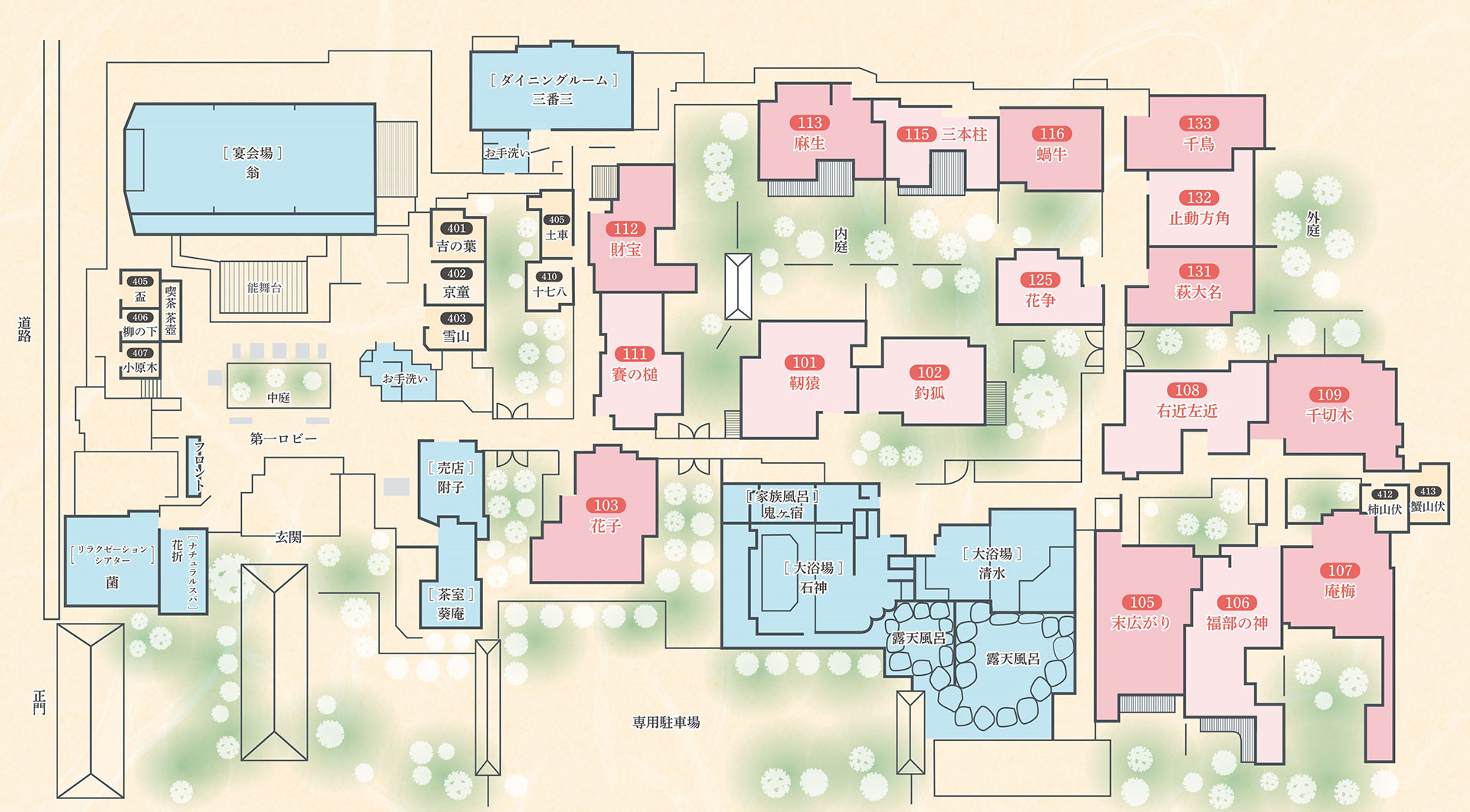 | 共通設備 | 電話・湯沸かしポット・お茶セット・冷蔵庫・ドライヤー・電気スタンド(貸出あり) ・CDプレイヤ(一部)・洗浄機付トイレ・金庫・浴衣・バスタオル |