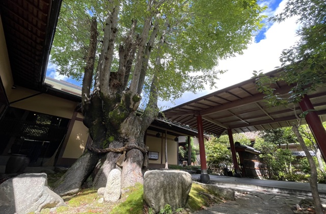 樹齢約800年の根株が、重さ1.5トンもの大石を抱いていることが名前の由来。