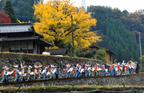 八女津媛神社の浮立は、神社に五穀豊穣や無病息災を祈願し、その御願成就に奉納する行事です。現在は、小中学生により毎年11月の矢部まつりに披露しています。
