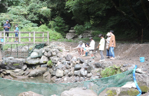 杣の清流に泳ぐヤマメの釣体験が楽しめます。釣った魚はその場で炭火焼にして頂けます。小雨時も屋根の下で体験可能です。