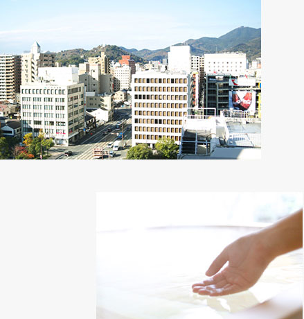 繁華街として賑わう新市街エリアで、熊本らしい自然豊かな風景に優しく包まれるような空間を樹木や石、草花を使って表現しました。