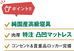 さらに、マットレスは純国産高級寝具の凸凹高反発マットレスを導入。凸凹プロファイルマットレスの突起が体の血行を良くし、通気性にも優れているので、質の良い睡眠をとることが出来ます。