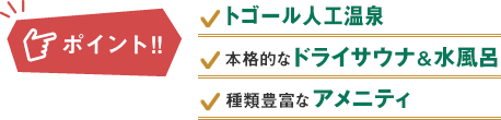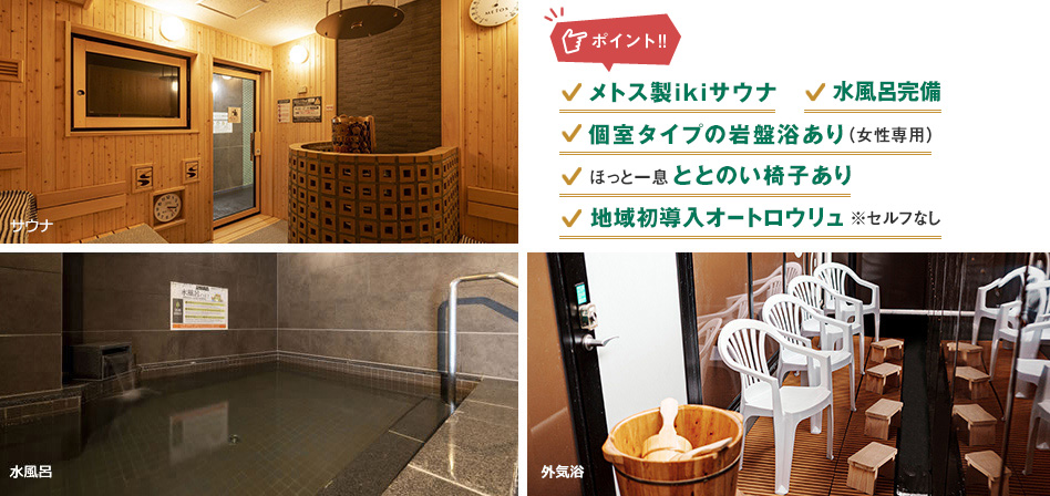 「神経痛」「リウマチ」「腰痛」はもちろん「疲労回復」「冷え性」にも効果があります。メトス社ikiドライサウナ・水風呂完備。