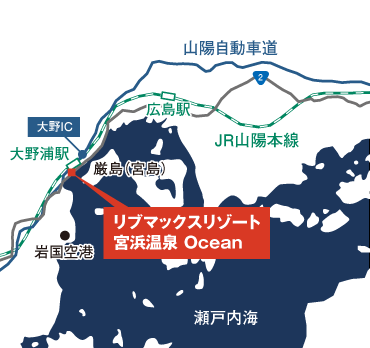 東海道・山陽新幹線ご利用の場合、「広島」駅よりJR山陽本線「大野浦」駅へ
