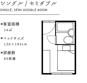 シングルルームは全室セミダブルベッドを採用しており、お1人様利用でゆったりお休みいただけます。またセミダブルルームとしてお2人様でリーズナブルにご利用いただくことも可能です。デスクスペースもございますので、ビジネス利用の方にもぴったり。落ち着いた空間でお寛ぎいただけます。