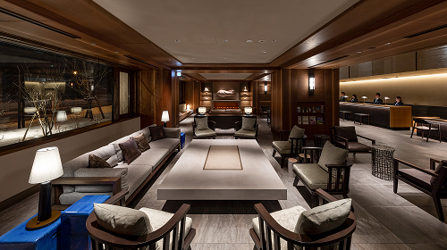 街の喧騒を忘れさせる、宿泊者専用の洗練された北欧調デザインのロビーで一休み。