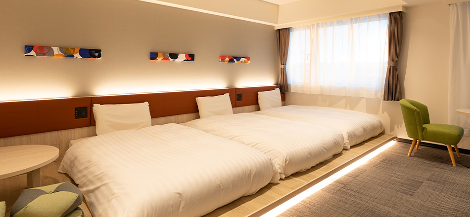 ご家族や友人同士のグループ旅行など、大人数での宿泊におすすめです。日本らしさが感じられる小上がりを設置した空間にベッドを3台設置しております。無料インターネット接続も利用できます。