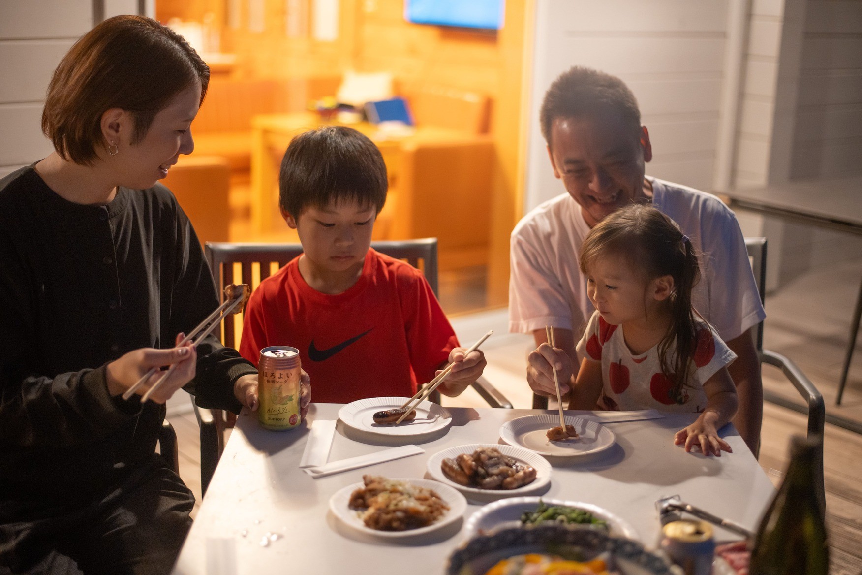 デッキテラスやリビングからは、駿河湾の素晴らしい景色が広がります。デッキテラスでは、夕陽が海に沈む様子を楽しみながらバーベキューを、リビングでは、テレビゲームを楽しみながら、みんなで賑やかにおしゃべりができます。