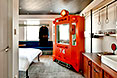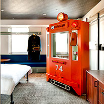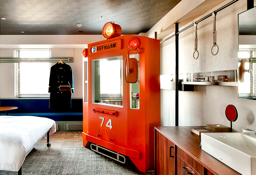 伊予鉄ルームは、 レトロなペンダントライトや吊革パイプなど遊び心満載のわくわくが詰まった客室。夜は帽子付きの駅員風ナイトウェアに身を包み、夢の世界へ出発 !