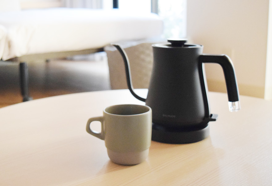全室バリュミューダの電気ポットを完備。コーヒーやお茶も備えてございますので、寛ぎのひとときをお過ごしください。