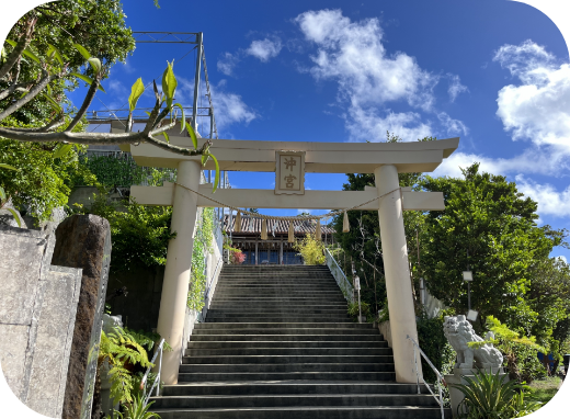 那覇市の奥武山公園内にある琉球八社の神社。南国の風情ある朱瓦の社殿と、複数の末社や天燈山御嶽をめぐる参拝ルートが楽しめます。航海安全や縁結びの祈願のパワースポットです。