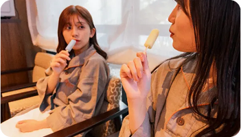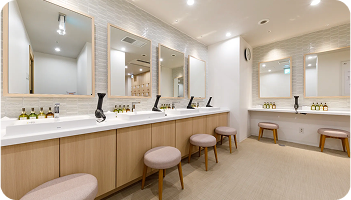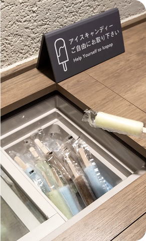 湯上がりスペースでは無料のアイスキャンディーを食べながらリラックス。アメニティーも充実だから、お部屋からタオルのみ持参で朝でも夜でも大浴場に直行できます。