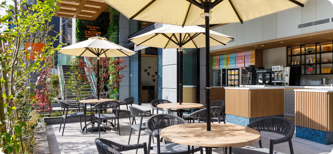 ホテル1Fの「カクウチ&カフェ CROOM STAND」はご宿泊のお客様に限らず、どなたでも気軽にご利用いただける、セルフスタイルのカフェバーです。