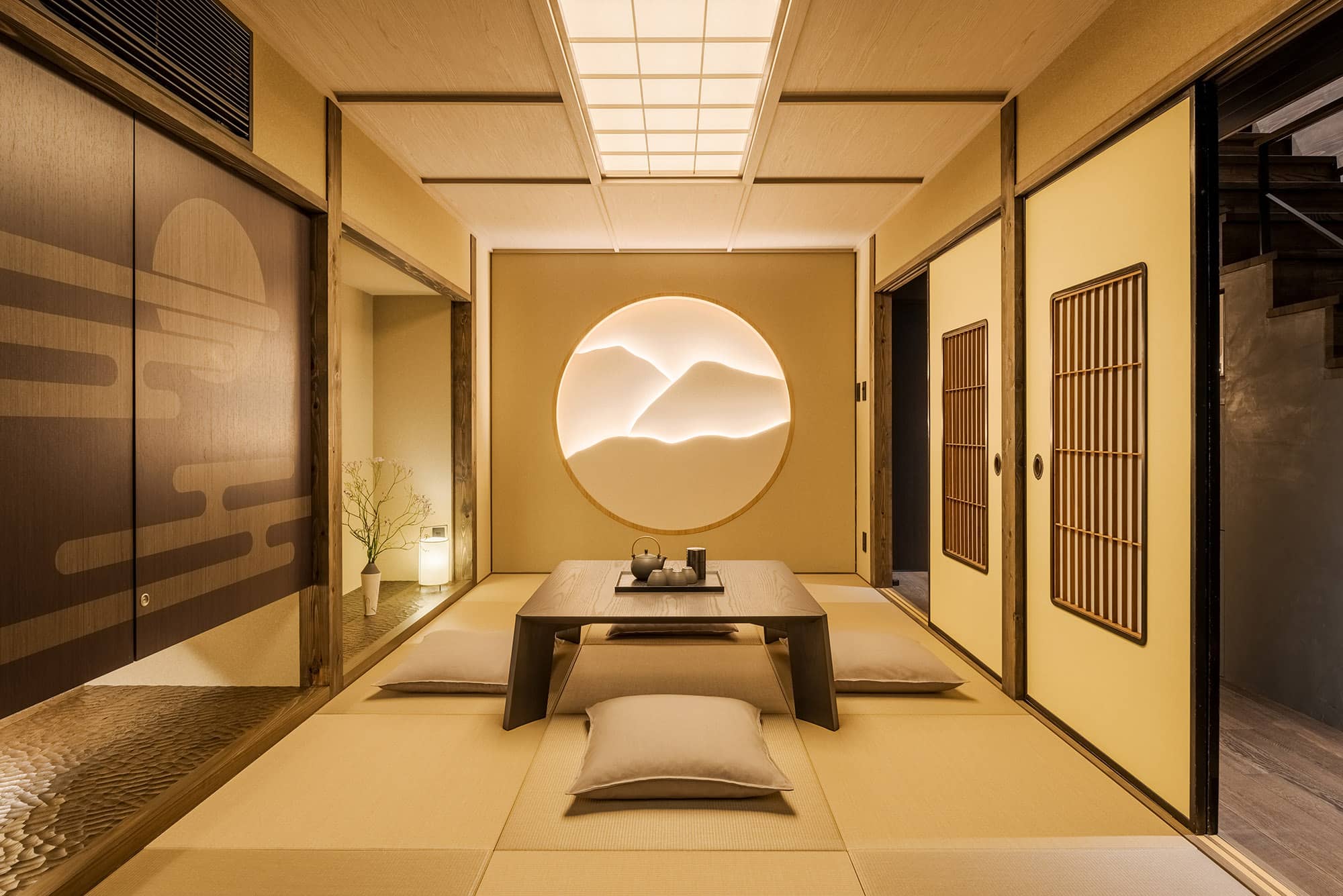 白山をはじめ、金沢を包み込むような雄大な山々を彷彿とさせる意匠。その煌めきに惹き込まれる優雅な設えの純和室。畳ならではの心地よいぬくもりを感じるひとときをお過ごしいただけます。