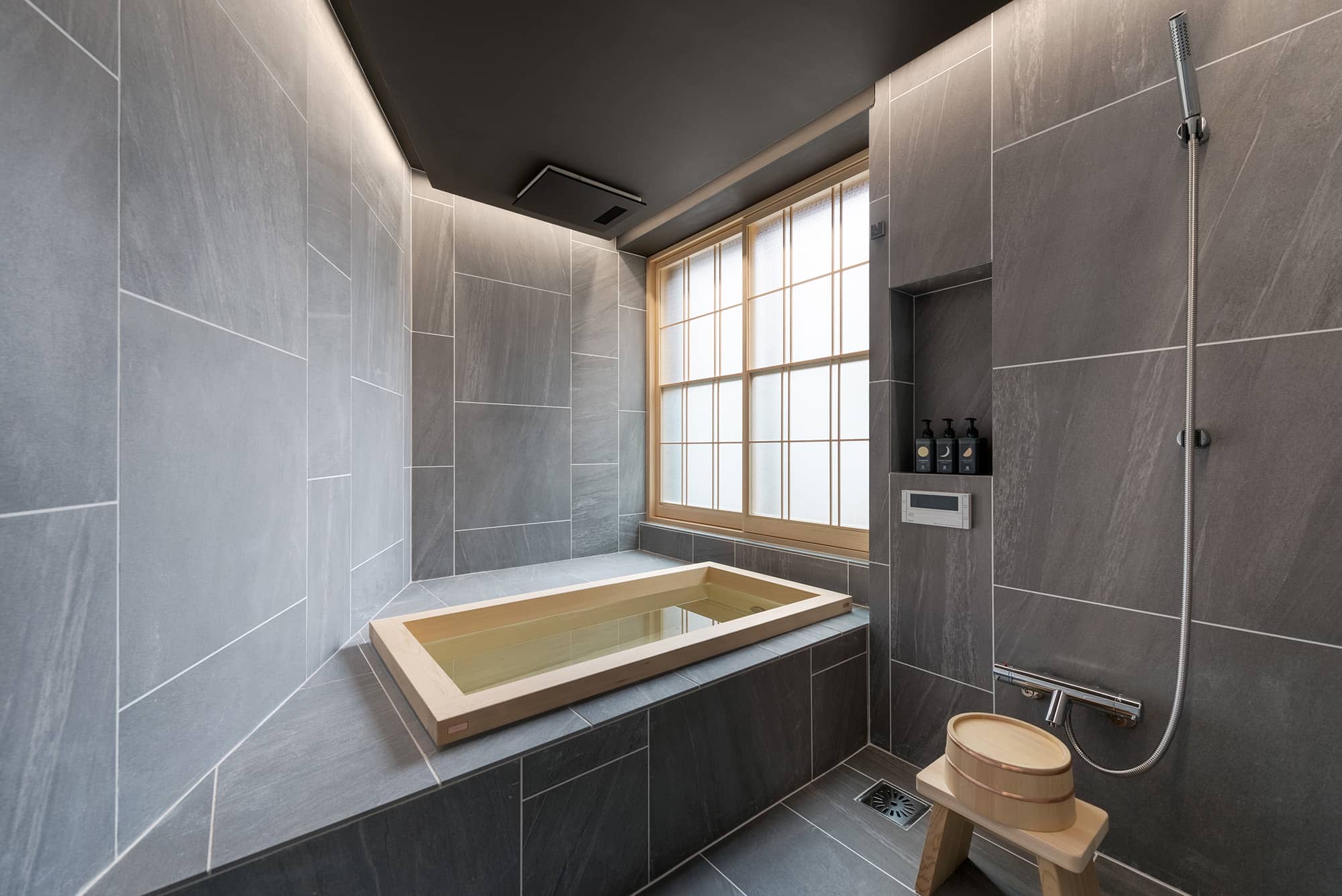 木のぬくもりを感じるヒノキ浴槽を設えた浴室。坪庭に面した雪見障子からやさしく光を取り入れながら、心身ともにリラックスしたバスタイム。2階にはシャワールームを完備し、大人数のご旅行も快適に。