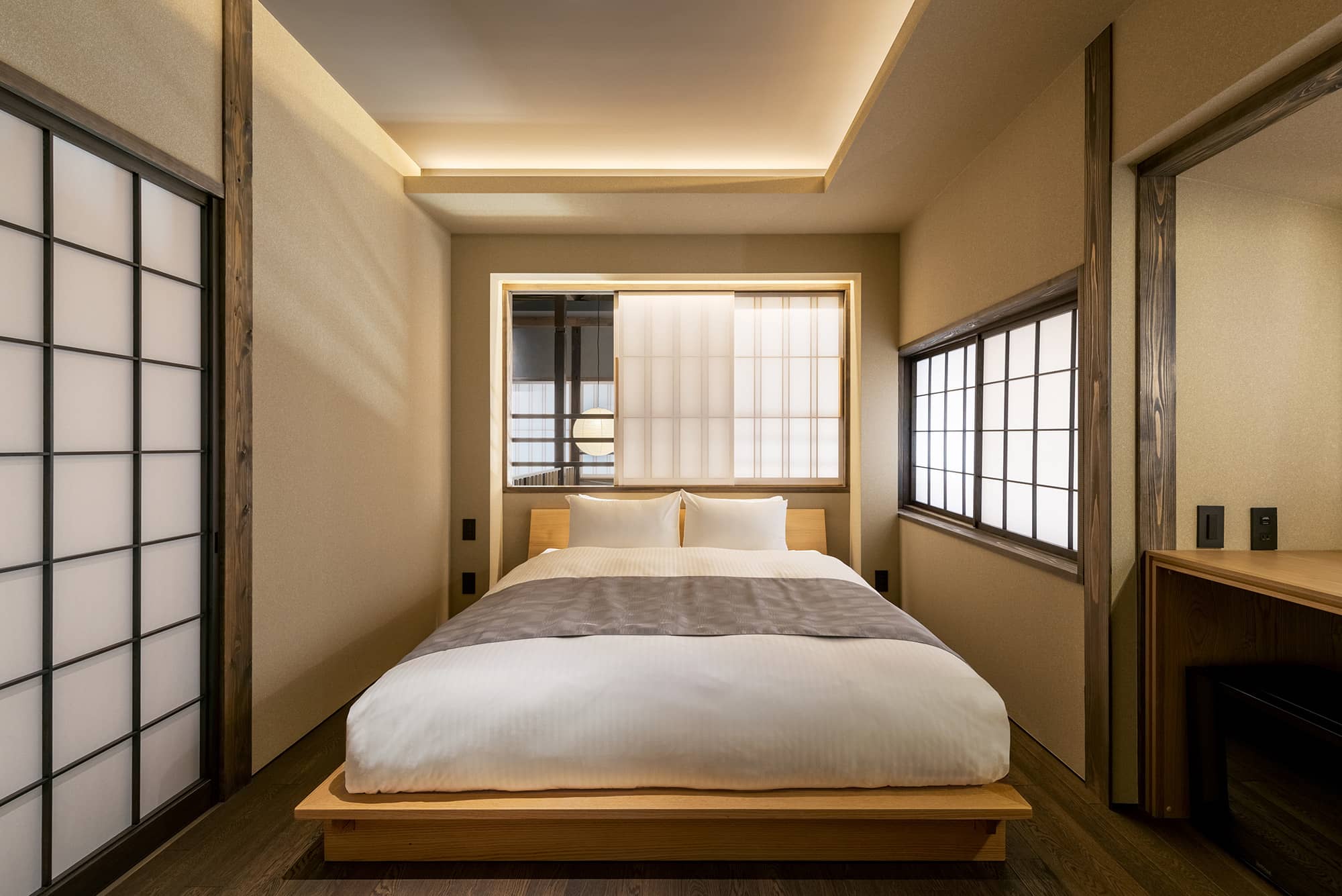 2階にはクイーンベッドを配し冷蔵庫も備えたた洋寝室と、金澤町家の面影そのままの糸屋格子から自然光が差し込む和室。柔和な雰囲気に包まれた空間で、一息つきながら心静かな時間をお過ごしいただけます。
