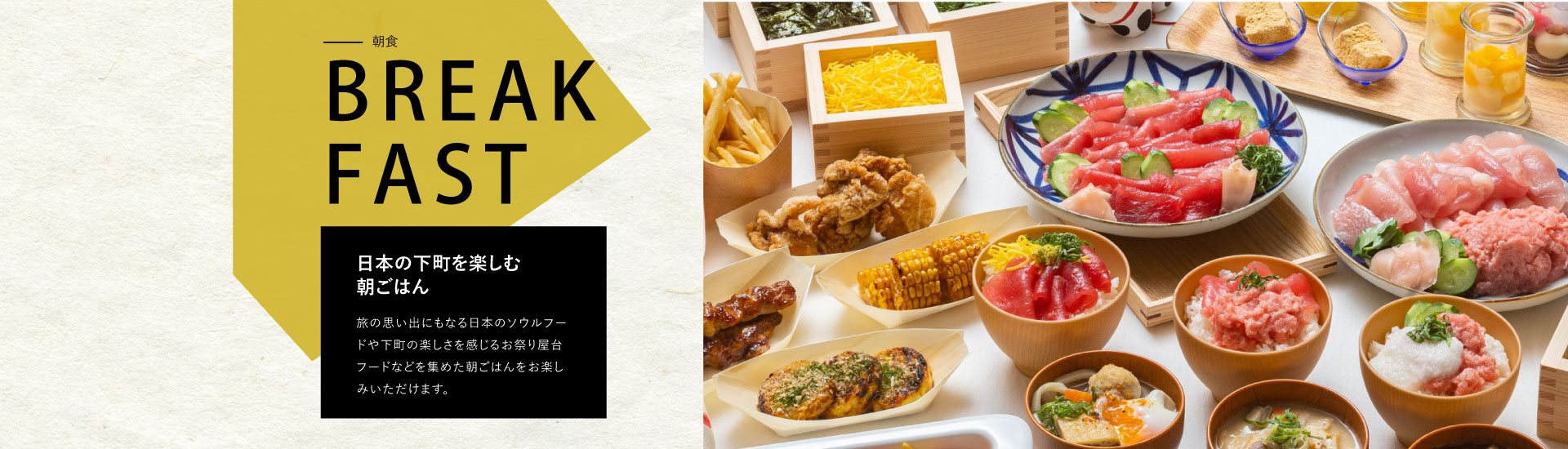 旅の思い出にもなる日本のソウルフードや下町の楽しさを感じるお祭り屋台フードなどを集めた朝ごはんをお楽しみいただけます。