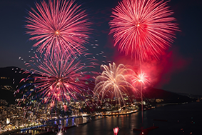 夏だけではなく年間を通して開催されている熱海名物です。会場である熱海湾は三面を山に囲まれた地形なので、海で上げる花火の音が山に反響するので、迫力満点です。
