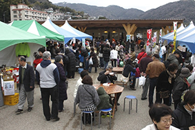 地元・南熱海地区で採れた季節の農産物や魚介類・干物等の販売、イカメンチ等の飲食出店、フリーマーケットが所狭しと並びます!また、利用無料の足湯もあり、日によってステージイベントも実施されます。