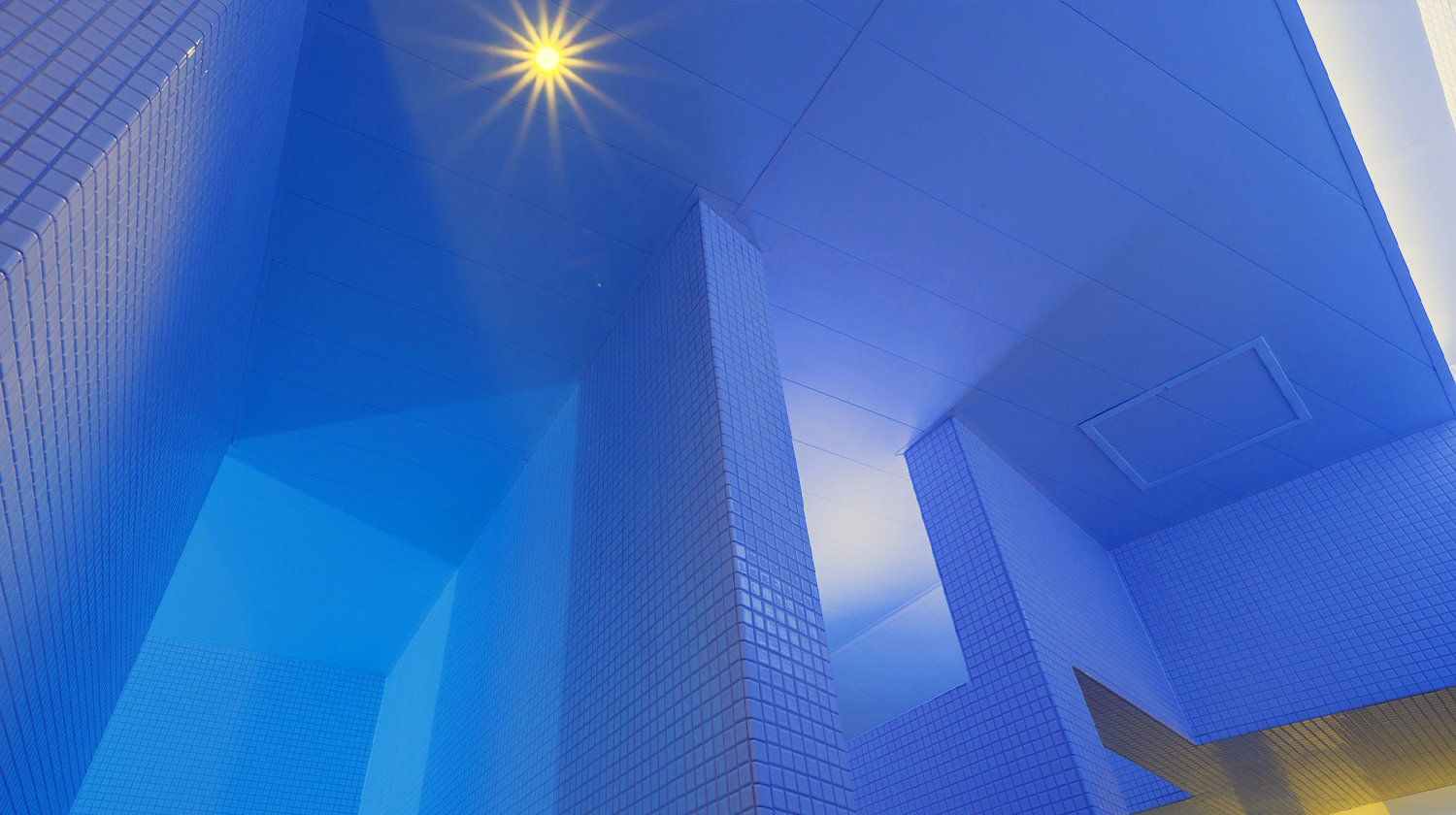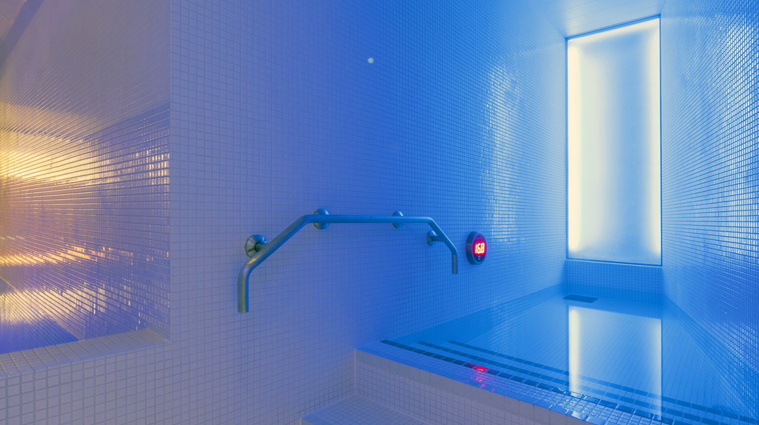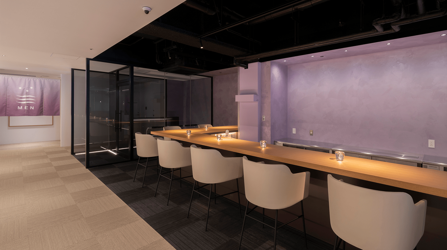 コンセプトは「内観へと誘う空間」。モノトーンをベースとした非日常的な浴槽と光の演出でリラックスへと導きます。心と身体をゆったりと包み込む空間でごゆっくりお寛ぎください。