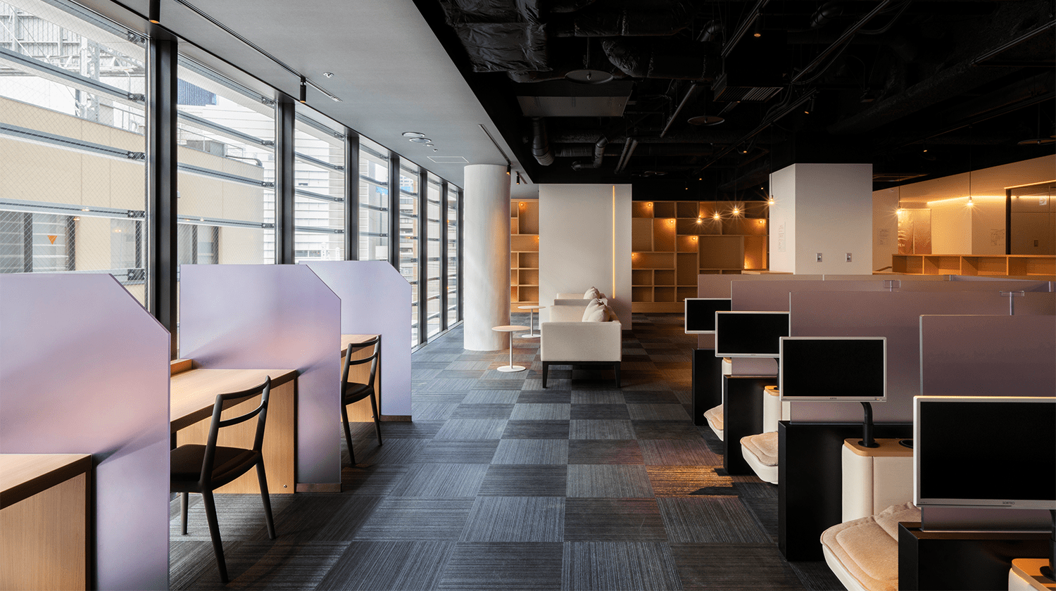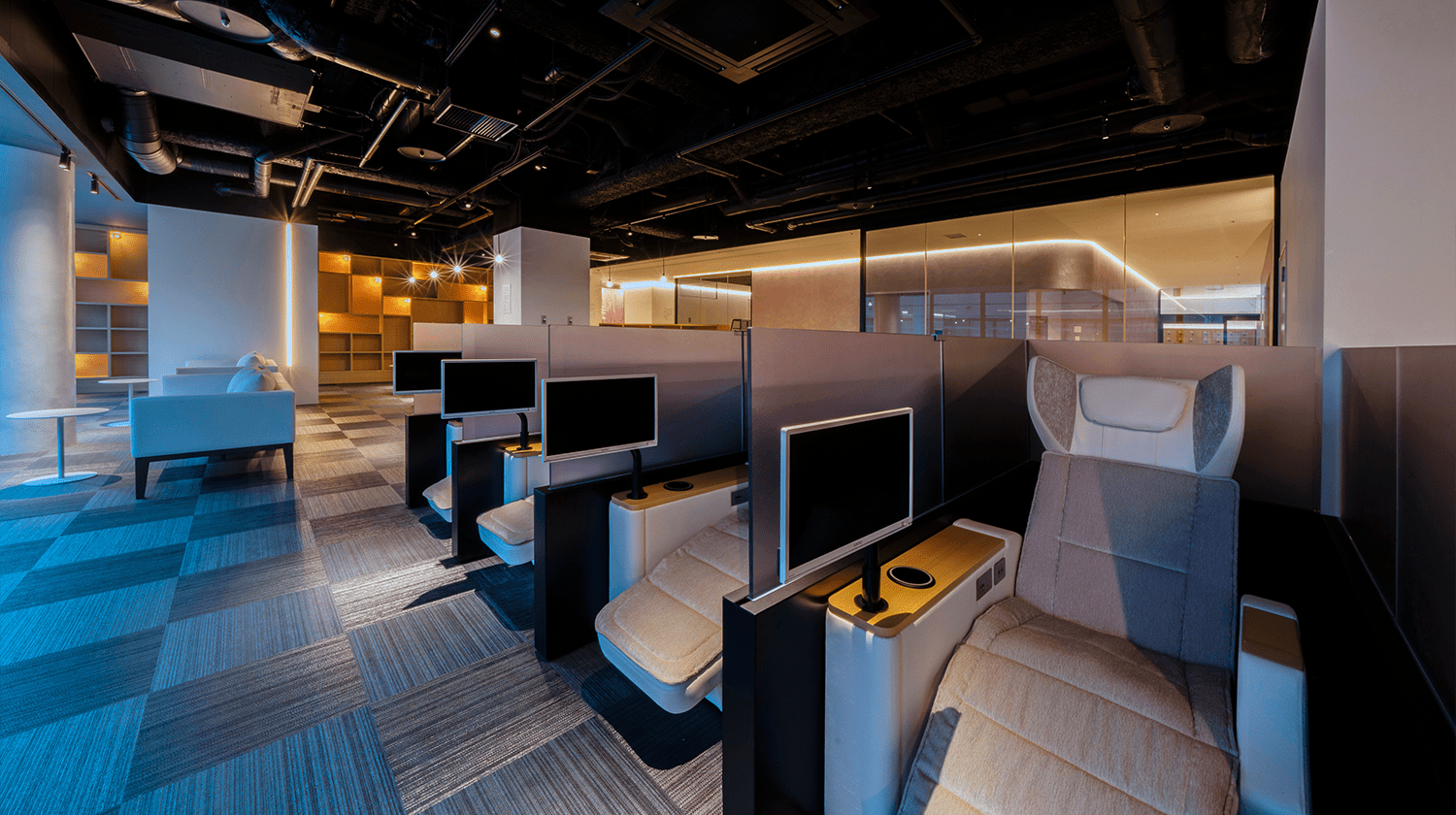 自分のスタイルに合わせてくつろぐ、こだわりの休憩スペース。テレビ付のリクライナー完備。お仕事や作業にもお使いいただけるデスクスペースやライブラリーも。コンセントやWi-Fiもご利用いただけます。