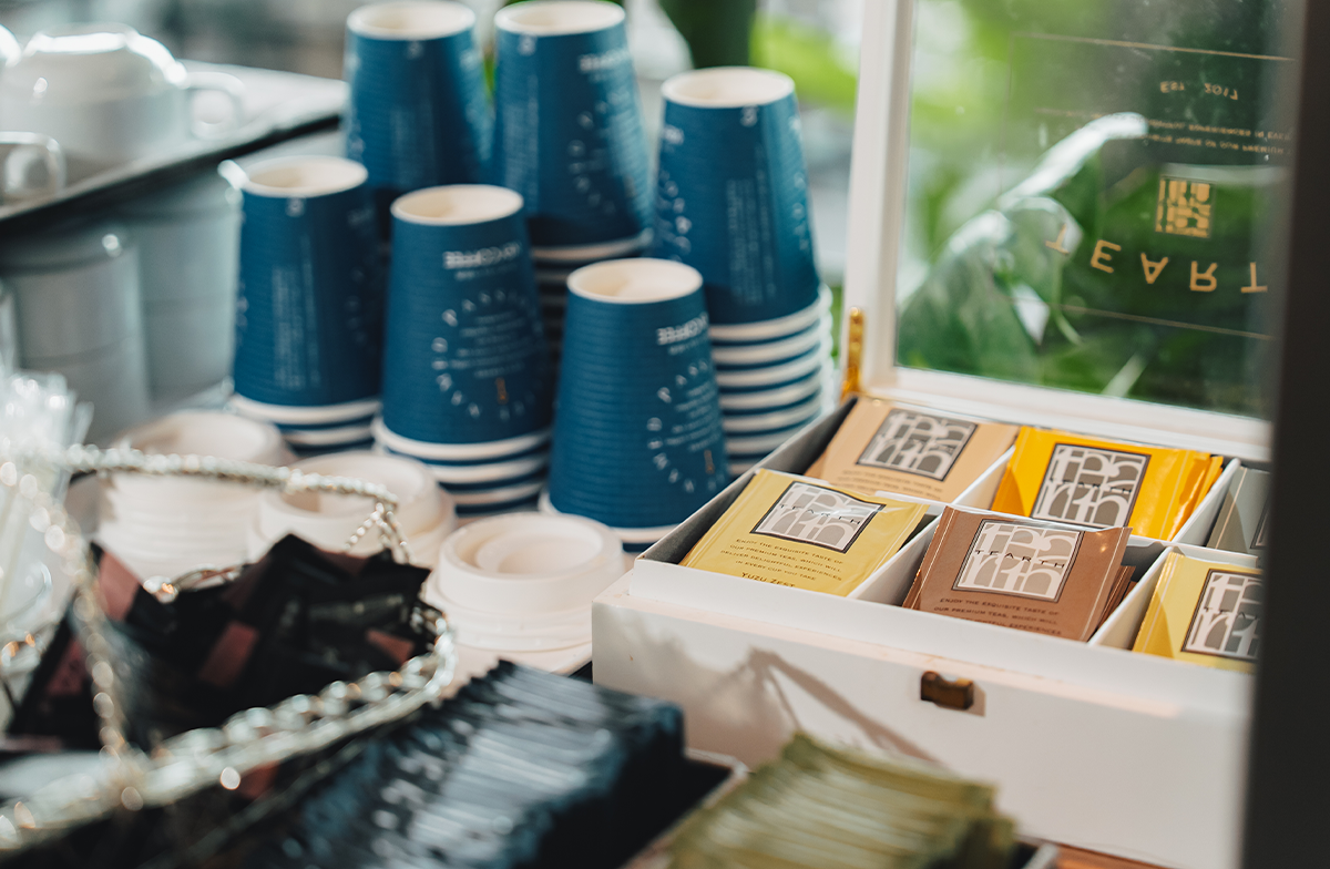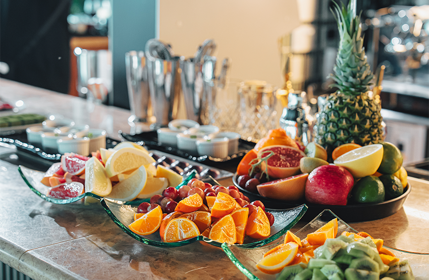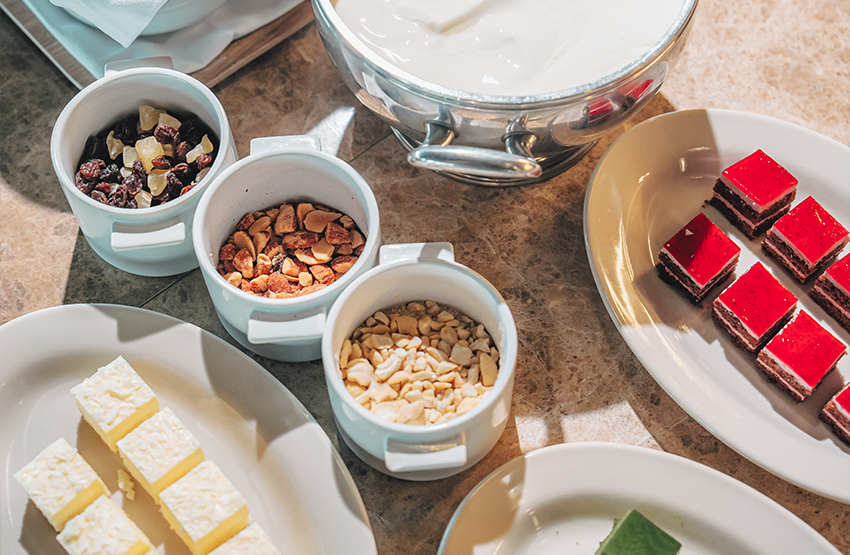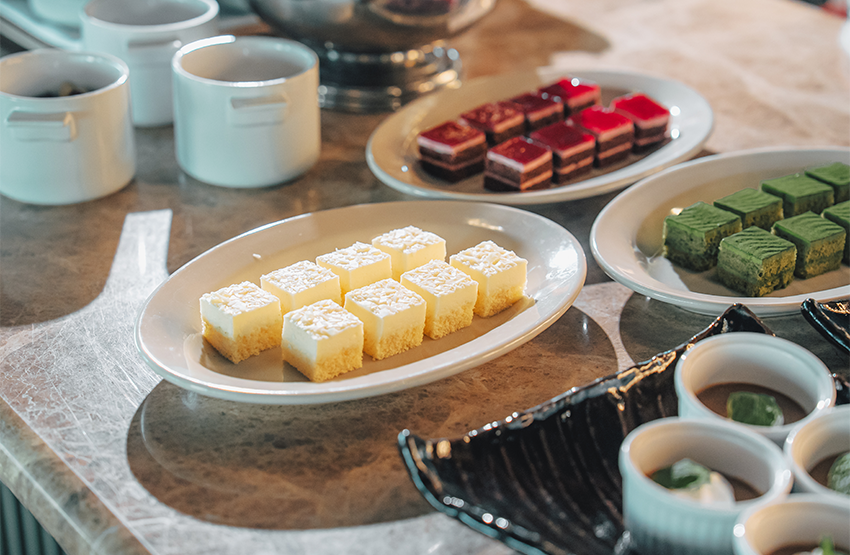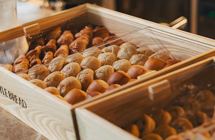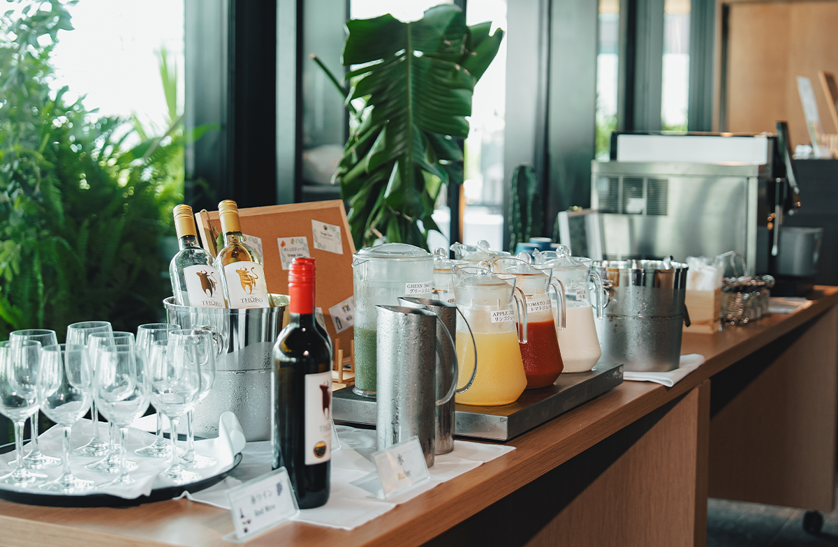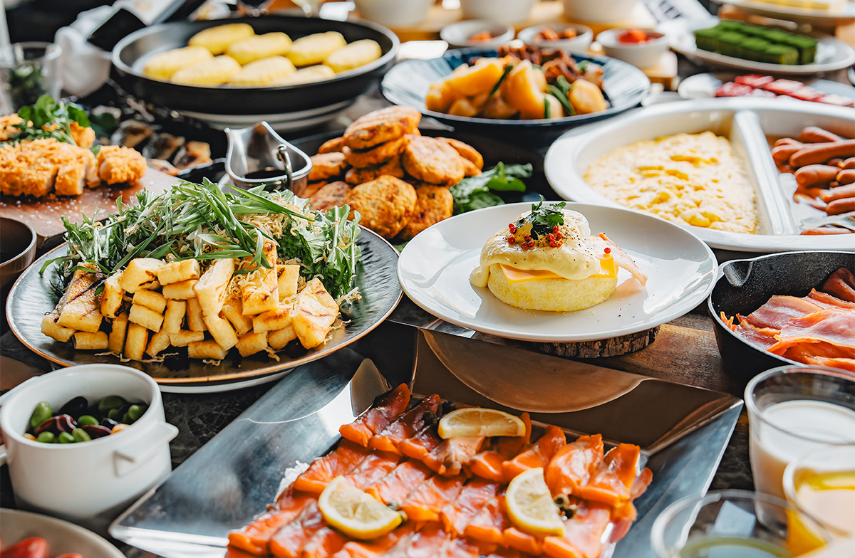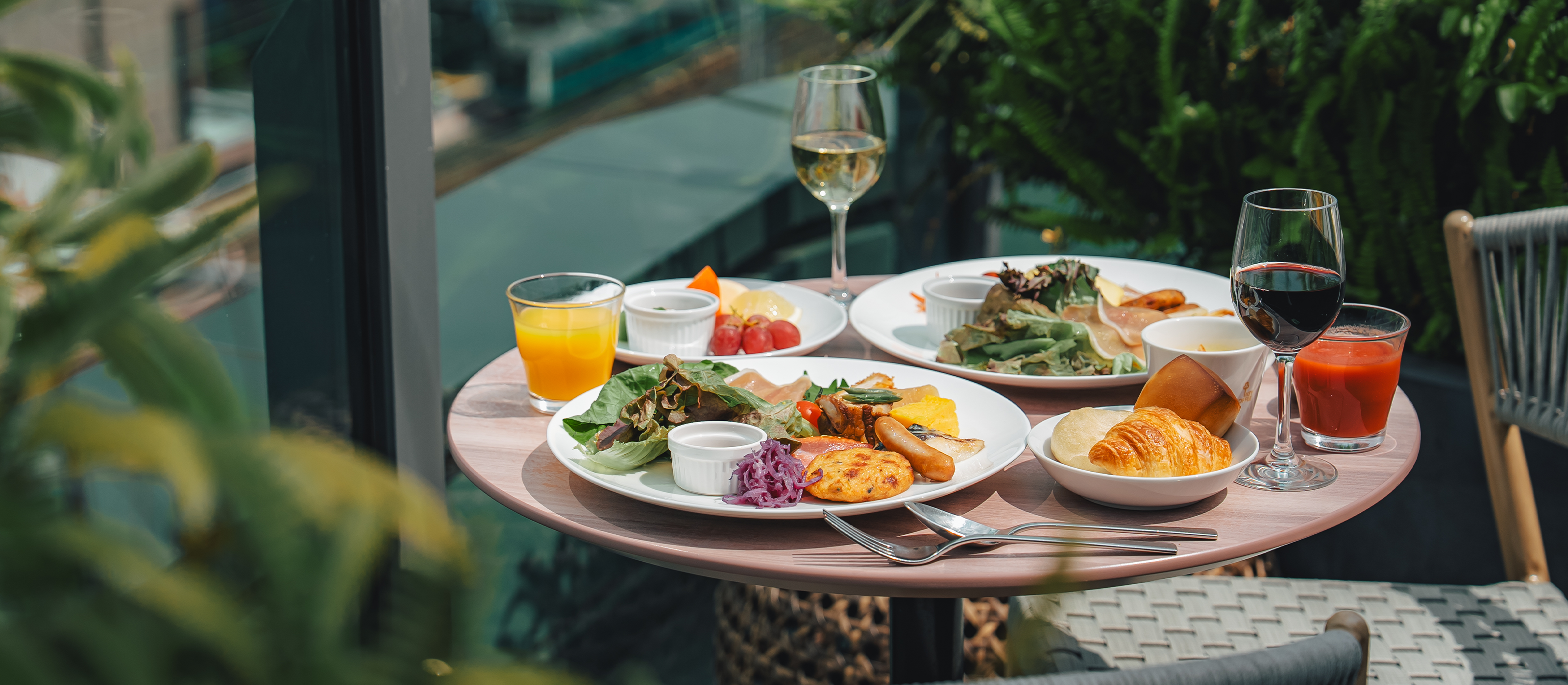 全面窓に囲まれた陽光差し込む室内、銀座の街並みが一望できるテラス席。店内には植物を配しており、さわやかな雰囲気の中で朝食をお楽しみいただけます。お好きな席にてお召し上がりください。