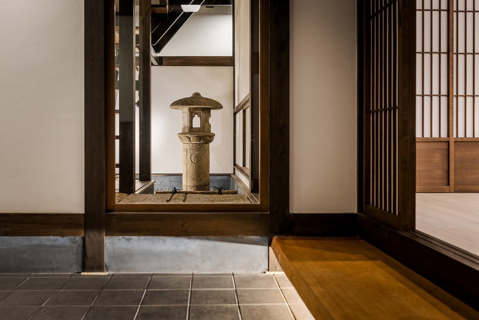 町家の中心にある石灯籠。暖簾をくぐり玄関に立つとすぐに出迎えます。もてなしの心が込められた、日本ならではの茶庭の奥深さと趣をお愉しみください。