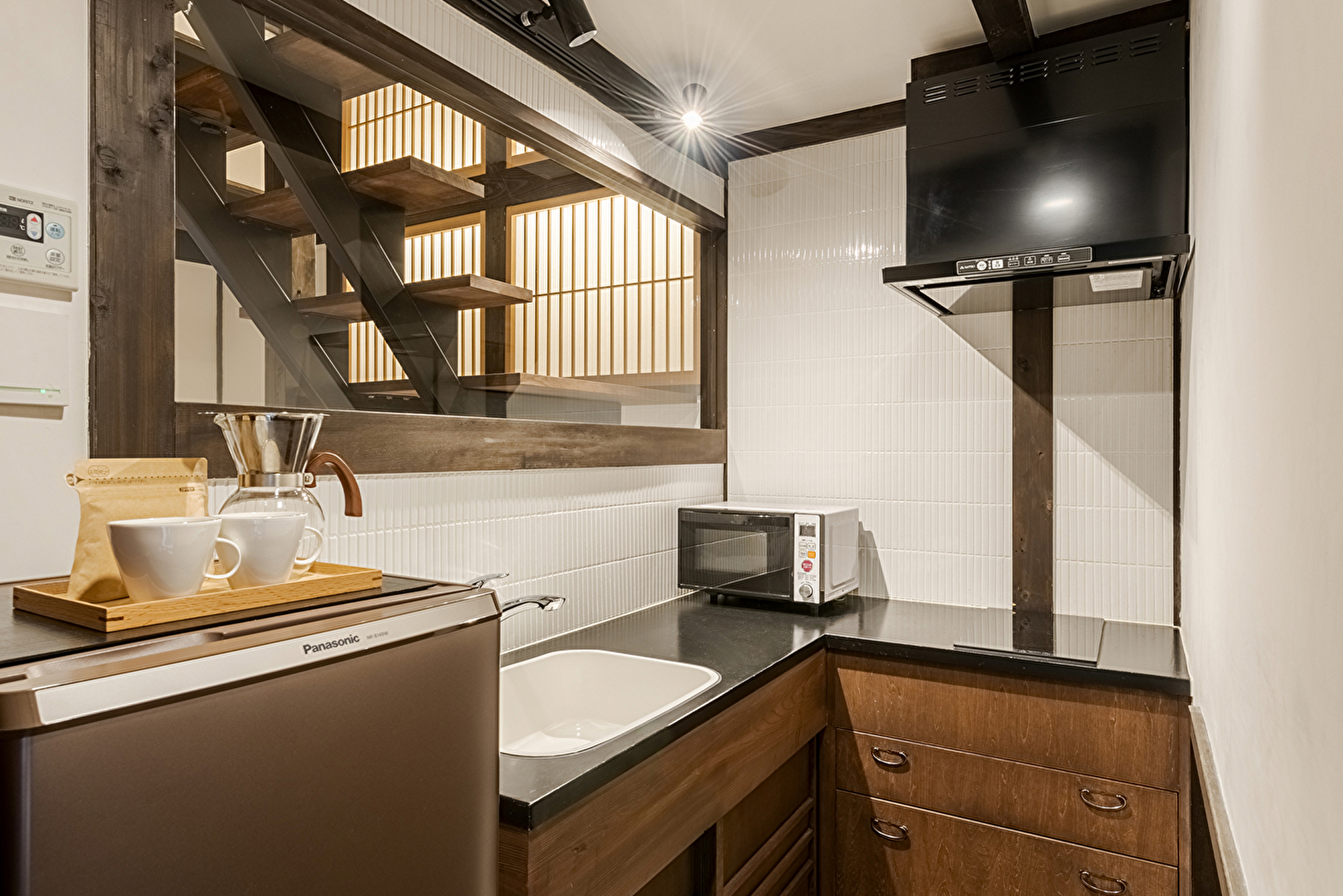 食器類、調理器具はもちろん、電子レンジ・炊飯器などを揃えたIHコンロ付きキッチン。徒歩圏内の「錦市場」には地元食材やおばんざいも。いつもと一味違うお料理をお楽しみください。