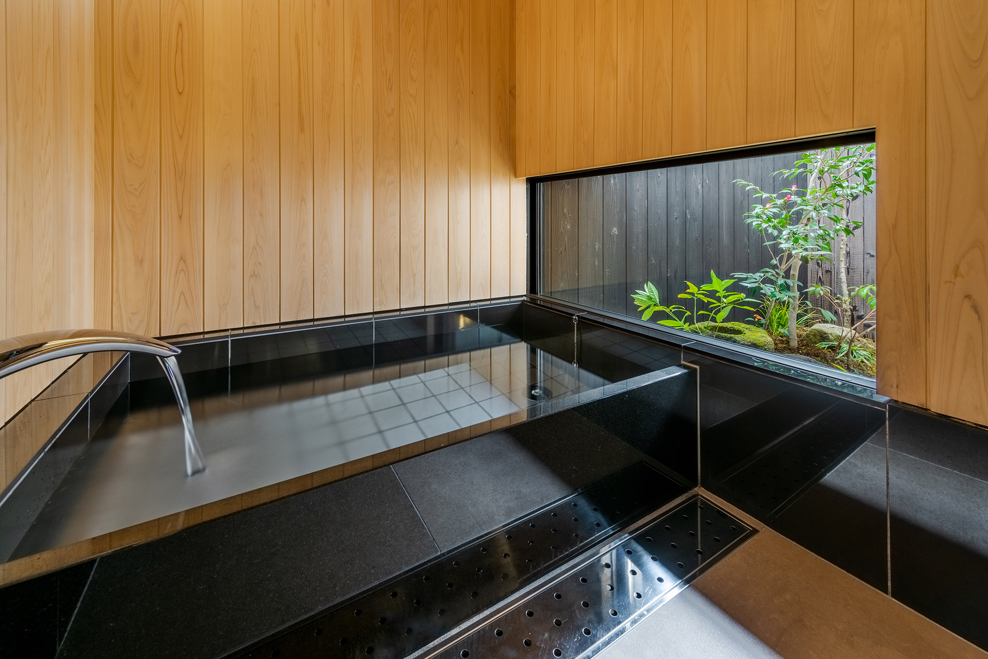 坪庭に面した広い浴槽を設えた浴室にはオーバーヘッドシャワーを完備。京都ならではの四季を感じながら、旅疲れを心身ともに癒すバスタイムをご堪能ください。